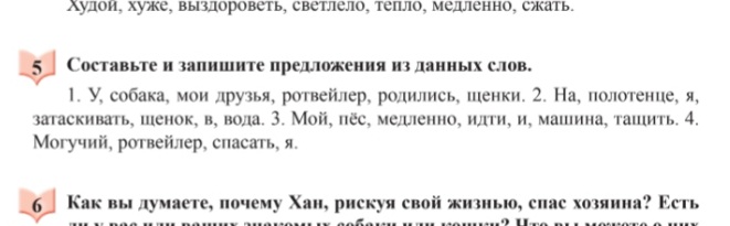 1.У моих друзей,собака родила щенков. 2. Я затаскиваю щенка в воду на полотенце. 3. Мы с собакой отправились на прогулку. 4. Я спас могучего ротвейлера