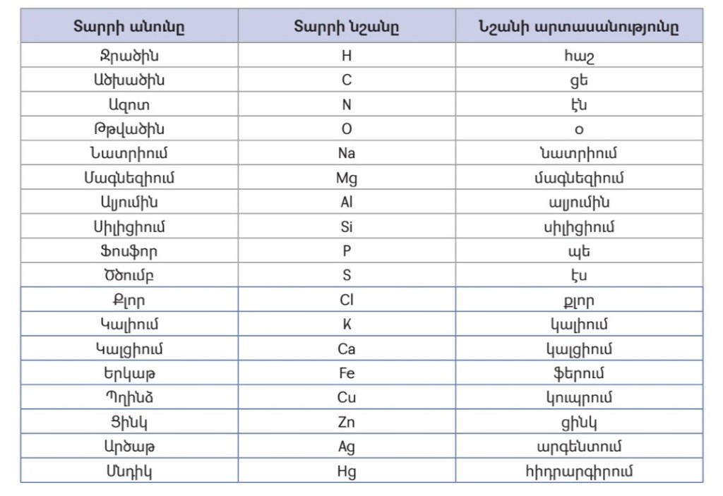 2.Ստորև ներկայացված են որոշ քիմիական տարրերի նշանները և դրանց հայերեն անվանումները, փորձիր սովորել: