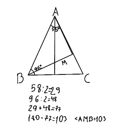 1)ABC եռանկյան A և B անկյունների կիսորդները հատվում են M կետում։ Գտեք <AMB-ն, եթե <A=58o , <B=96o ։