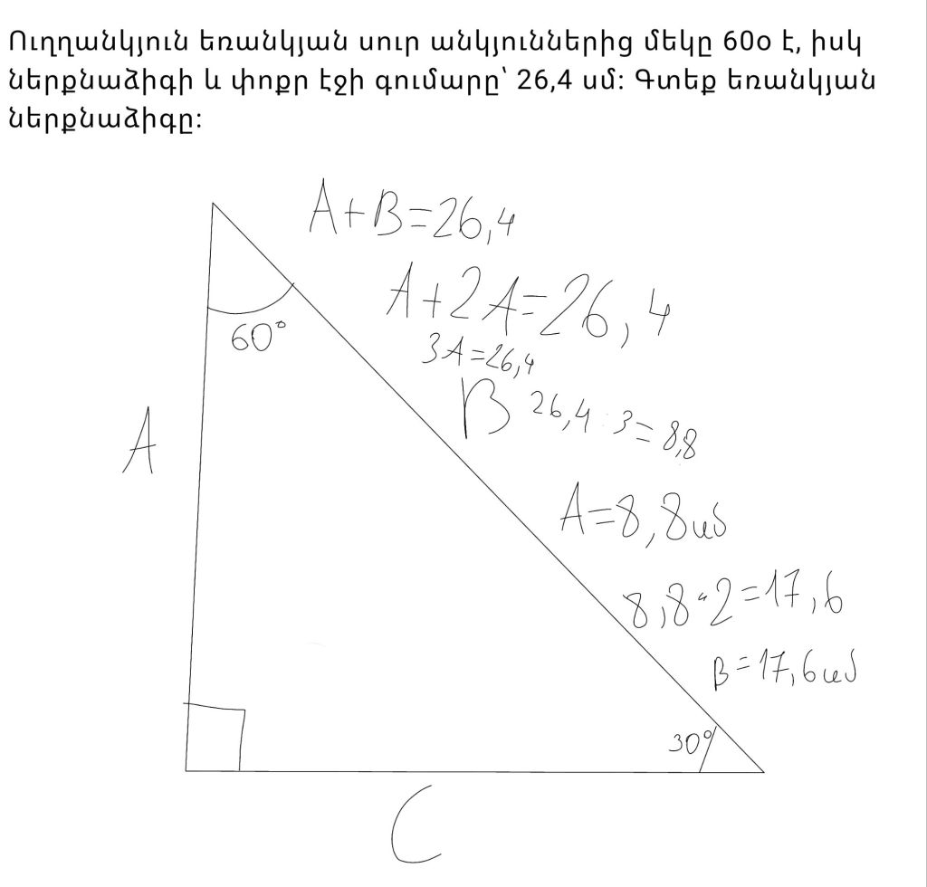 3)Ուղղանկյուն եռանկյան սուր անկյուններից մեկը 60o է, իսկ ներքնաձիգի և փոքր էջի գումարը՝ 26,4 սմ։ Գտեք եռանկյան ներքնաձիգը։