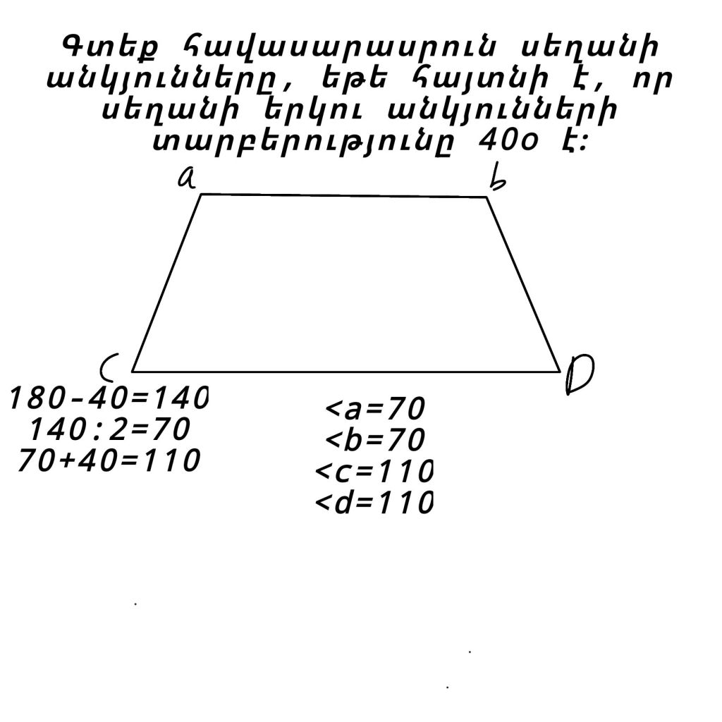1)Գտեք հավասարասրուն սեղանի անկյունները, եթե հայտնի է, որ սեղանի երկու անկյունների տարբերությունը 40o է։
