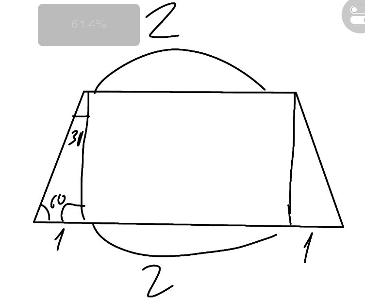 2)Հավասարասրուն սեղանի մեծ հիմքը 4մ է, սրունքը՝ 2մ, իսկ դրանց կազմած անկյունը՝ 60o ։ Գտեք սեղանի փոքր հիմքը։