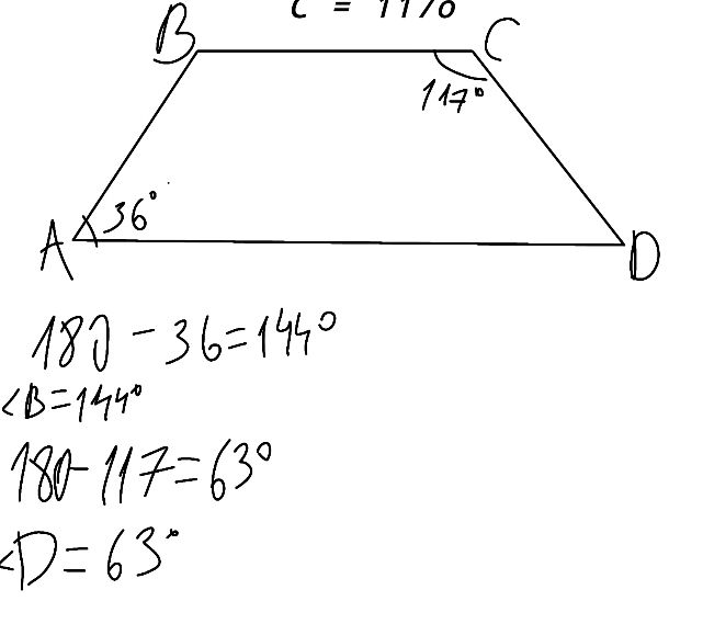 1)Գտեք AD և BC հիմքերով սեղանի B և D անկյունները, եթե < A = 36o, < C = 117o։