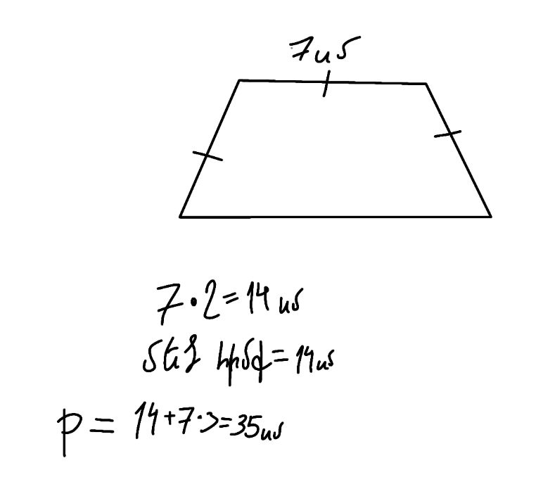 1)Հավասարասրուն սեղանի սրունքը հավասար է փոքր հիմքին և մեծ հիմքից փոքր է 2 անգամ։ Գտե՛ք սեղանի պարագիծը, եթե փոքր հիմքը 7սմ է։