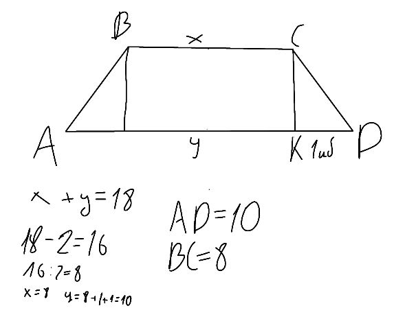 2)ABCD հավասարասրուն սեղանի C գագաթից AD մեծ հիմքին տարված է CK ուղղահայացը։ Գտե՛ք սեղանի հիմքերը, եթե դրանց գումարը 18սմ է, իսկ KD=1սմ։