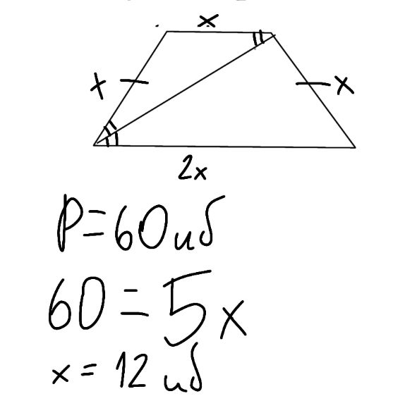 2)Հավասարասրուն սեղանի մեծ հիմքը երկու անգամ մեծ է փոքր հիմքից։Սեղանի անկյունագիծը դրա սուր անկյունը բաժանում է հավասար մասերի։ Գտե՛ք սեղանի փոքր հիմքը, եթե սեղանի պարագիծը 60սմ է։