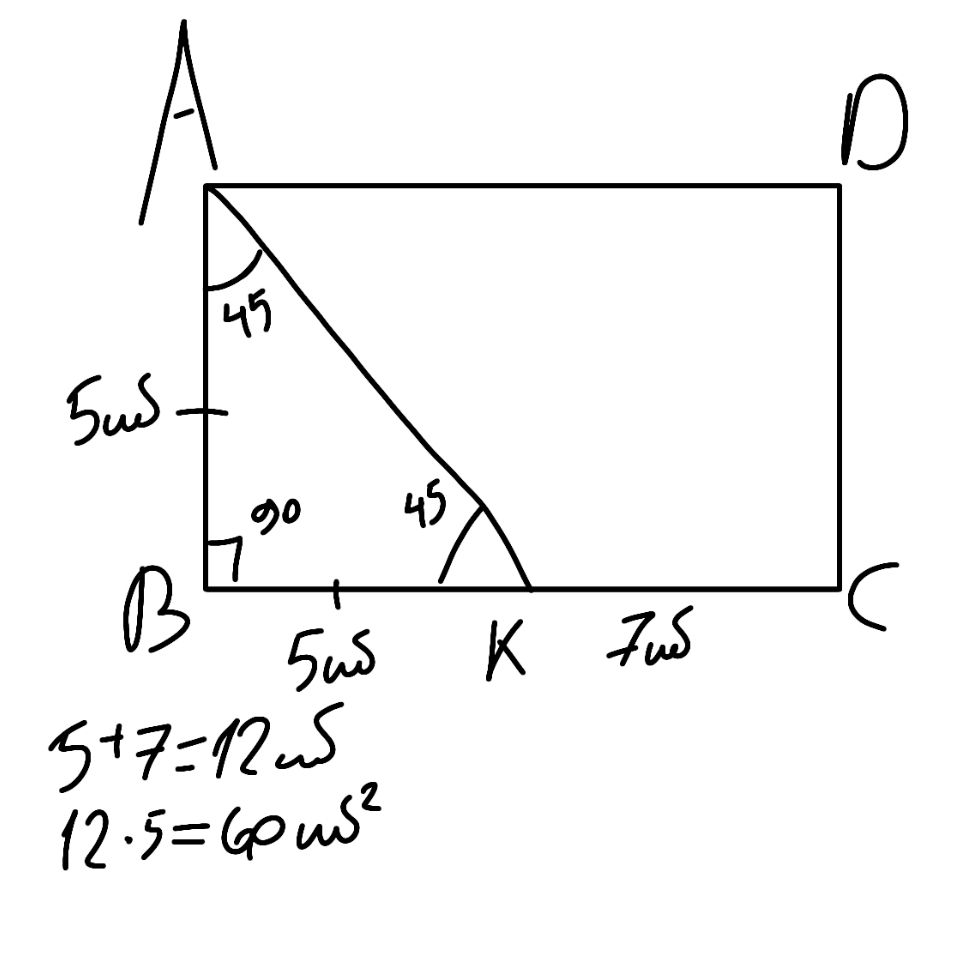 4)ABCD ուղղանկյան A անկյան կիսորդը BC կողմը հատում է K կետում։Հայտնի է, որ BK=5սմ , KC=7սմ։ Գտեք այդ ուղղանկյան մակերեսը։