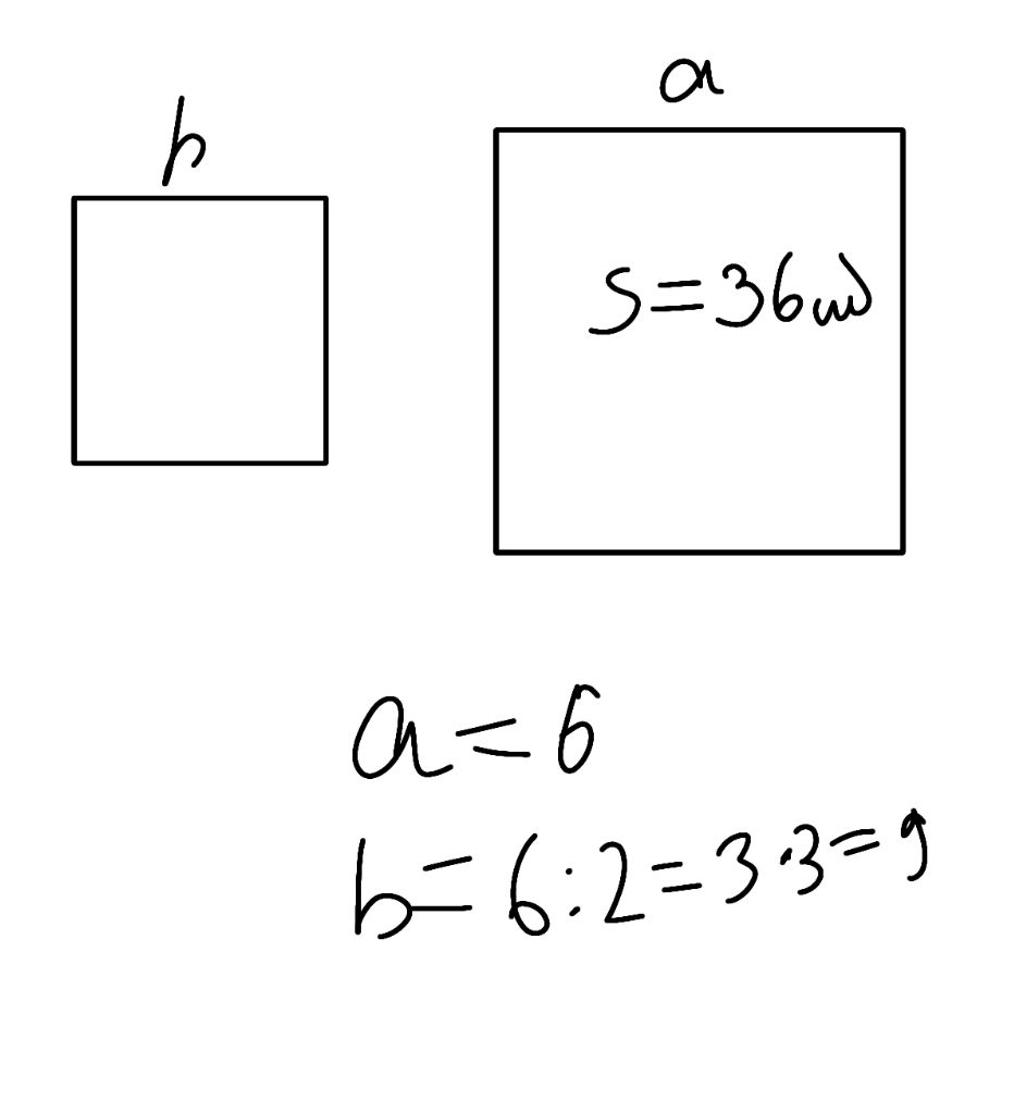 2)Քառակուսաձև սենյակներից մեկի կողմը 2 անգամ փոքր է մյուսի կողմից: Գտե՛ք փոքր սենյակի մակերեսը, եթե մեծի մակերեսը 36 մ է: