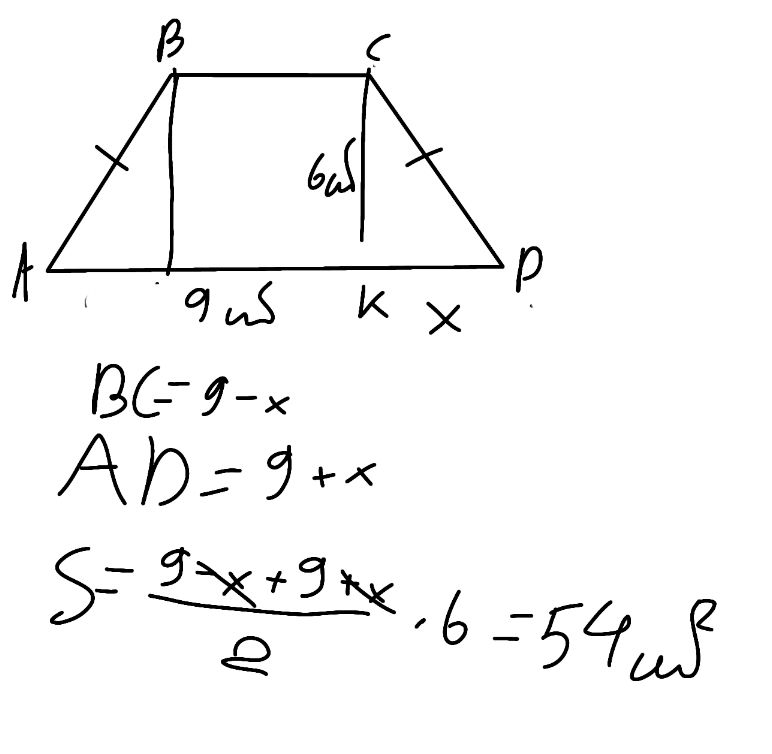 6)CK-ն ABCD հավասարասրուն սեղանի C գագաթից AD մեծ հիմքին տարված բարձրությունն է: Գտեք սեղանի մակերեսը, եթե CK = 6 սմ, AK = 9 սմ: